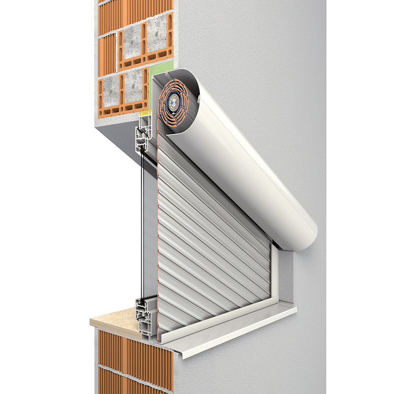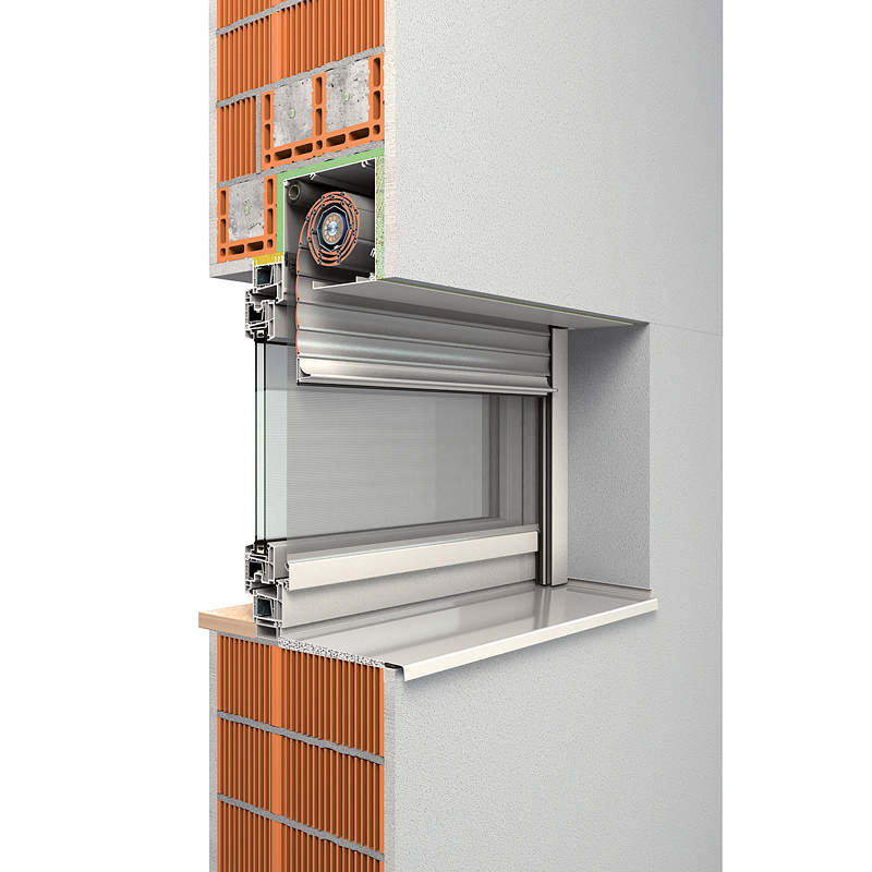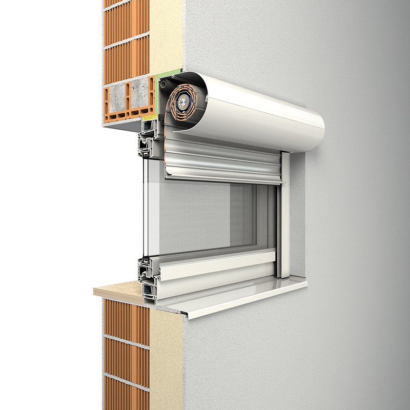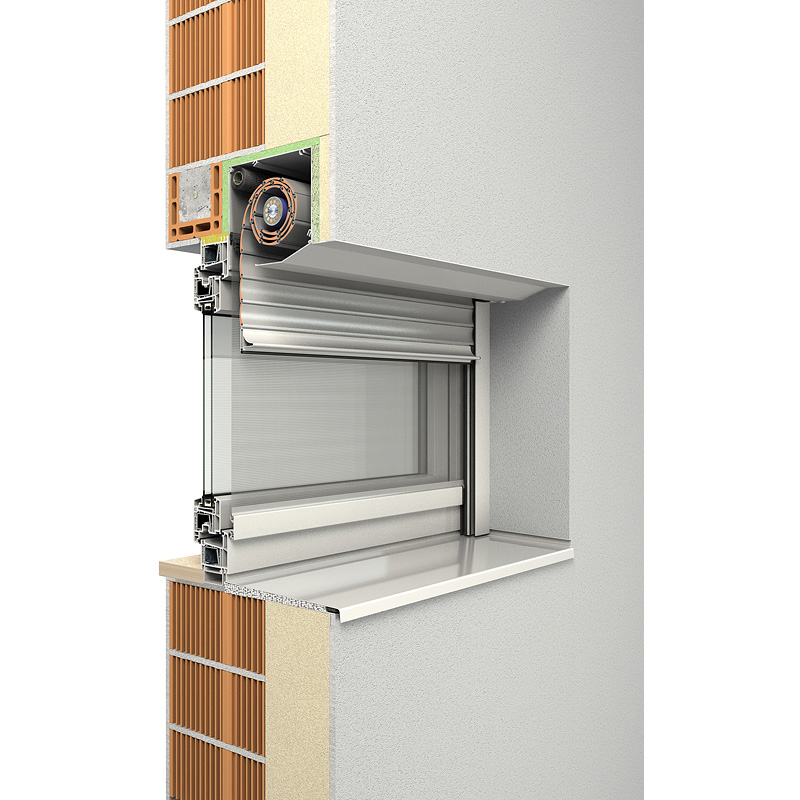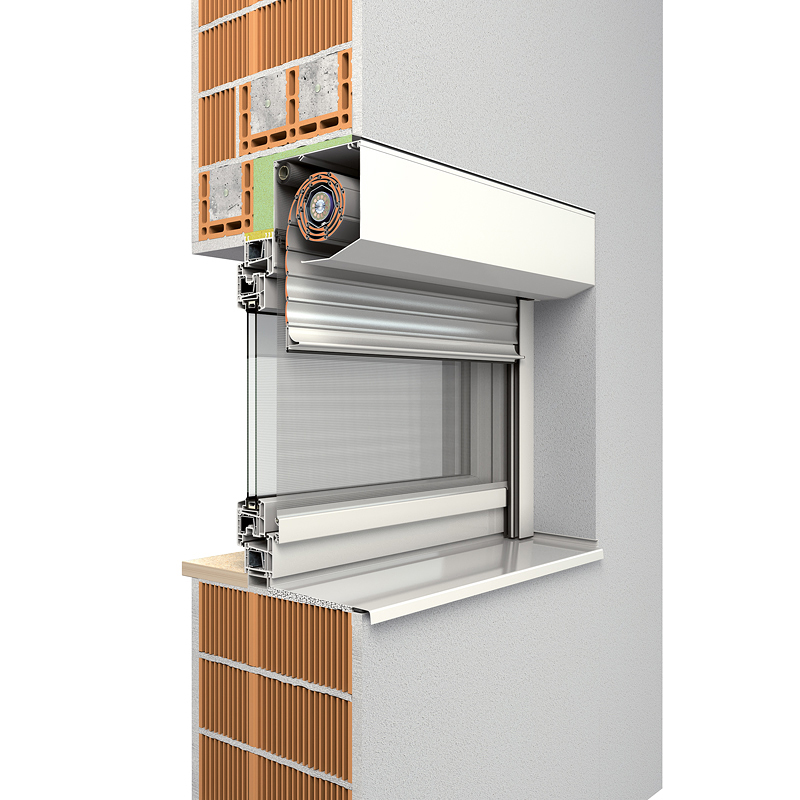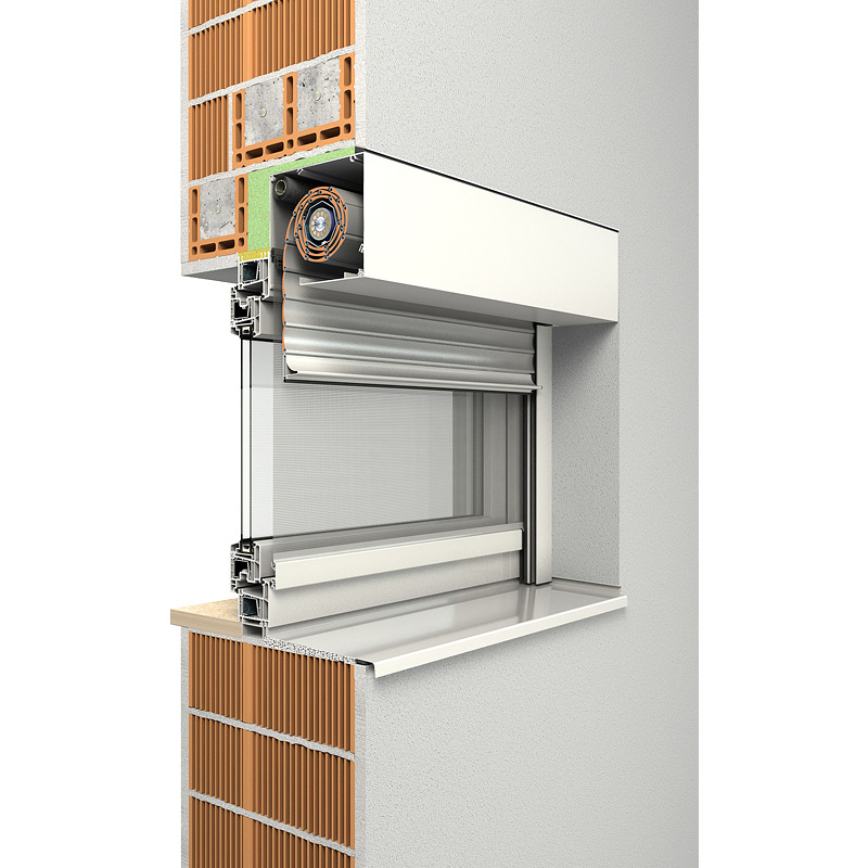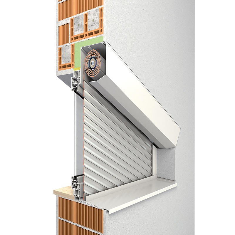 Das Rollladensystem passt sich in die Fassade ein und kann wahlweise mit eckiger oder fünfeckiger Frontblende verwendet werden.